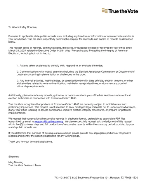 Through these open records requests, True the Vote is documenting accountability. These requests don’t assume wrongdoing — they simply ask for facts: what actions have been taken, what plans exist, and how officials are ensuring compliance.