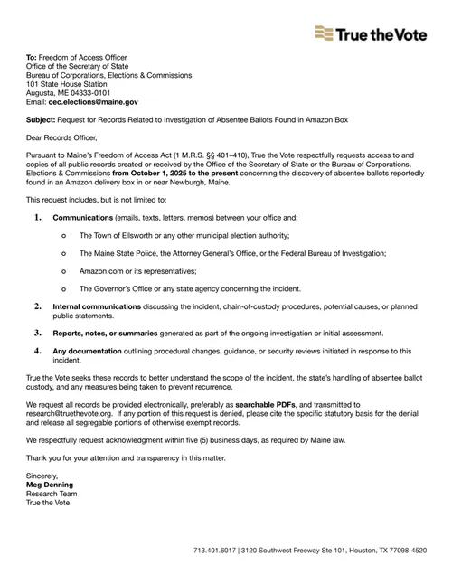In addition to the Executive Order records requests, True the Vote has also filed an Open Records Request in Maine after a resident opened an Amazon package and found bundles of blank absentee ballots.